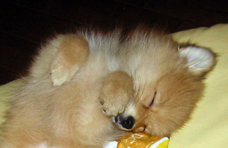 | 生後3ヶ月当時の爆睡姿です。体は倍以上に大きくなったけど、今も変わらず爆睡のときはこのポーズ。おやつをねだるときには、ひたすらジャンプしまくるポメらしからぬ跳躍力が自慢です。 |