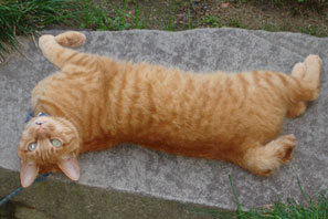 | みーにゃはお外が大好き。でもね、迷子になるといけないからお庭でしか遊ばせてもらえないんだけど、大きな石のベットやふかふかの芝生があってお昼寝には最適なの。寝起きをパシャ! |